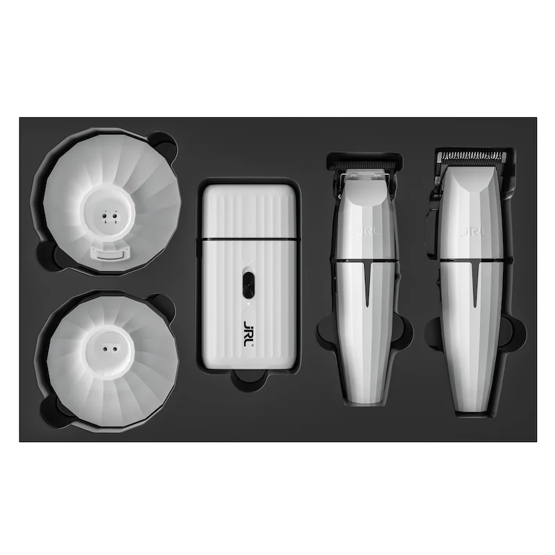 De JRL Ghost Collection Kit 2 combineert stijl, kracht en precisie in één exclusieve voordeelset. Met een strak wit design en geavanceerde technologie biedt deze set alles wat je nodig hebt voor professionele resultaten, van fades en contouren tot een gladde afwerking.